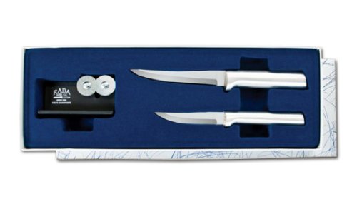 Rada Cutlery Paring Pair Gift Set Knife Plus Sharpener 3 Pc Boxed Set Made in USA Aluminum Handles